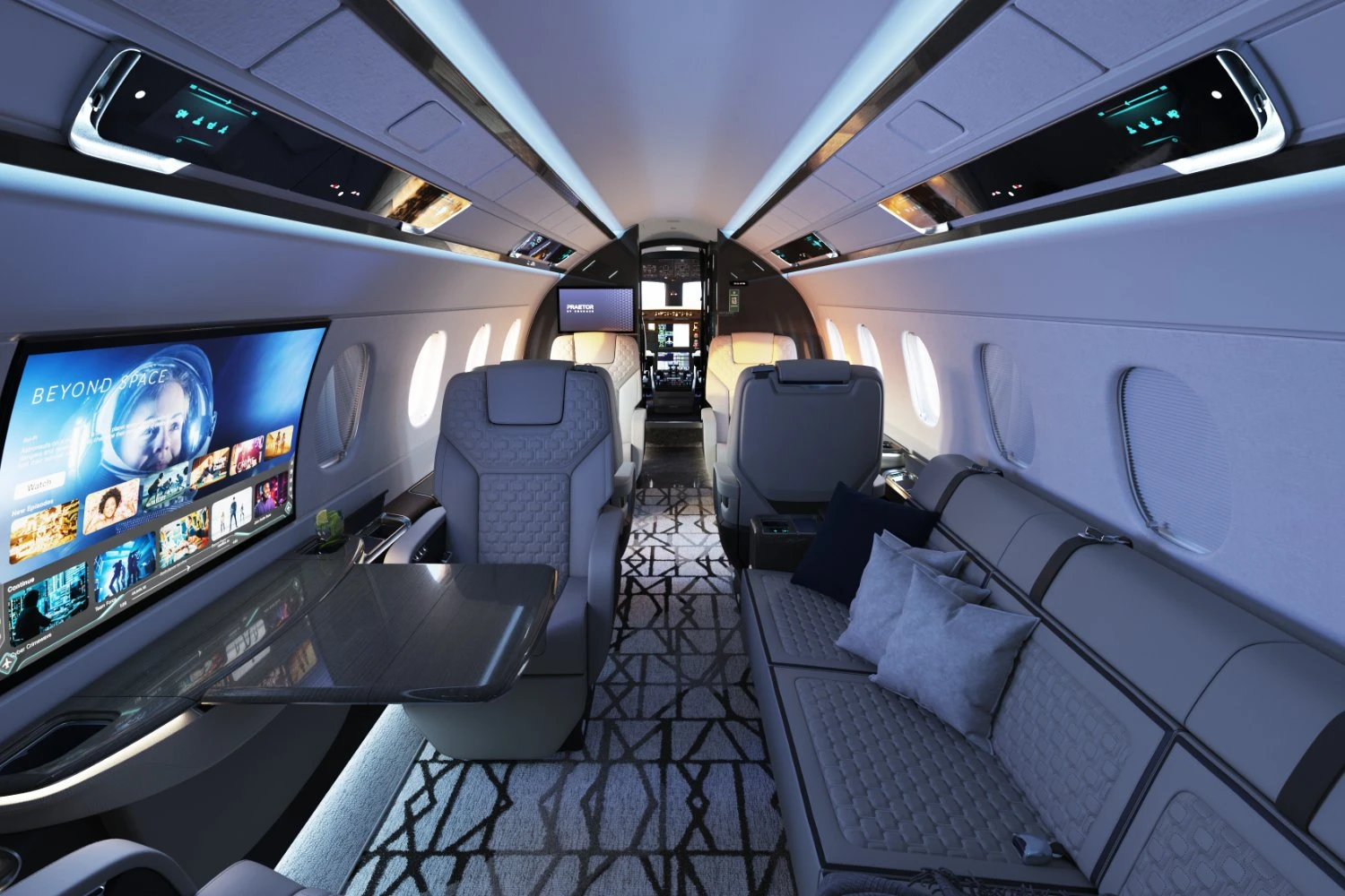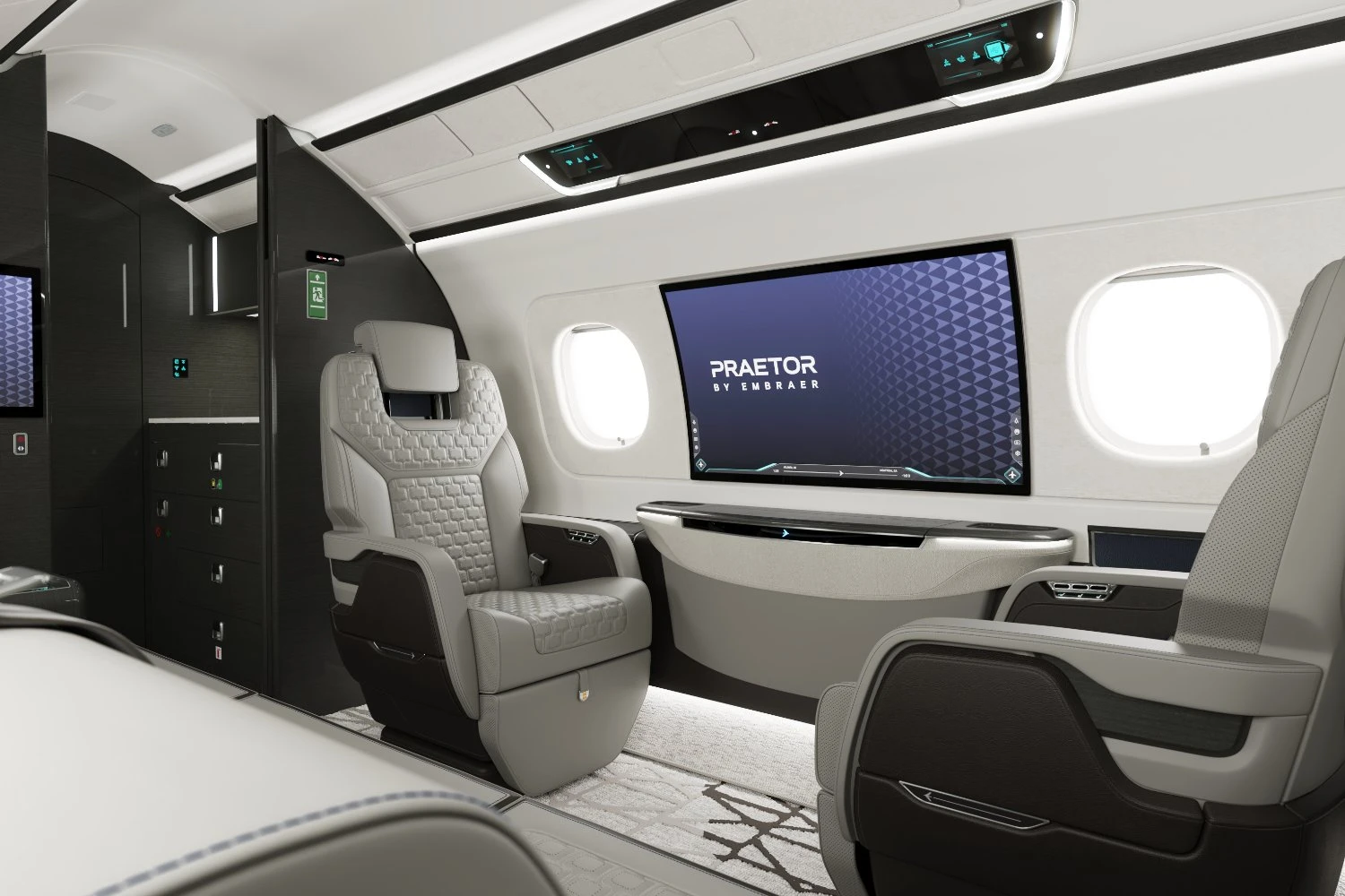 Seating has been re-engineered, with adjustable cushion firmness, dual lumbar support and updated headrests. Embraer also introduced a divan configuration that converts into a bed, along with a revised berthing process intended to speed transitions between seating and rest modes.