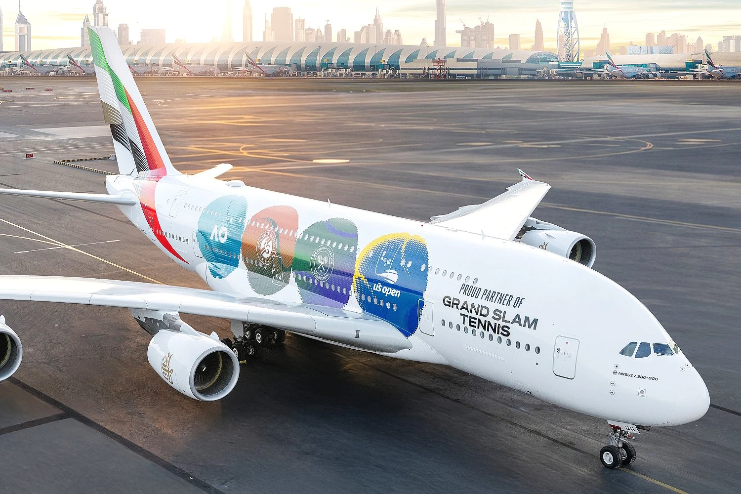 Emirates has introduced a new special Airbus A380 livery celebrating its sponsorship of all four Grand Slam tennis tournaments. The design features four circular graphics, each referencing one of the majors — Australian Open, Roland-Garros, Wimbledon and the US Open — applied to a single aircraft in the fleet.