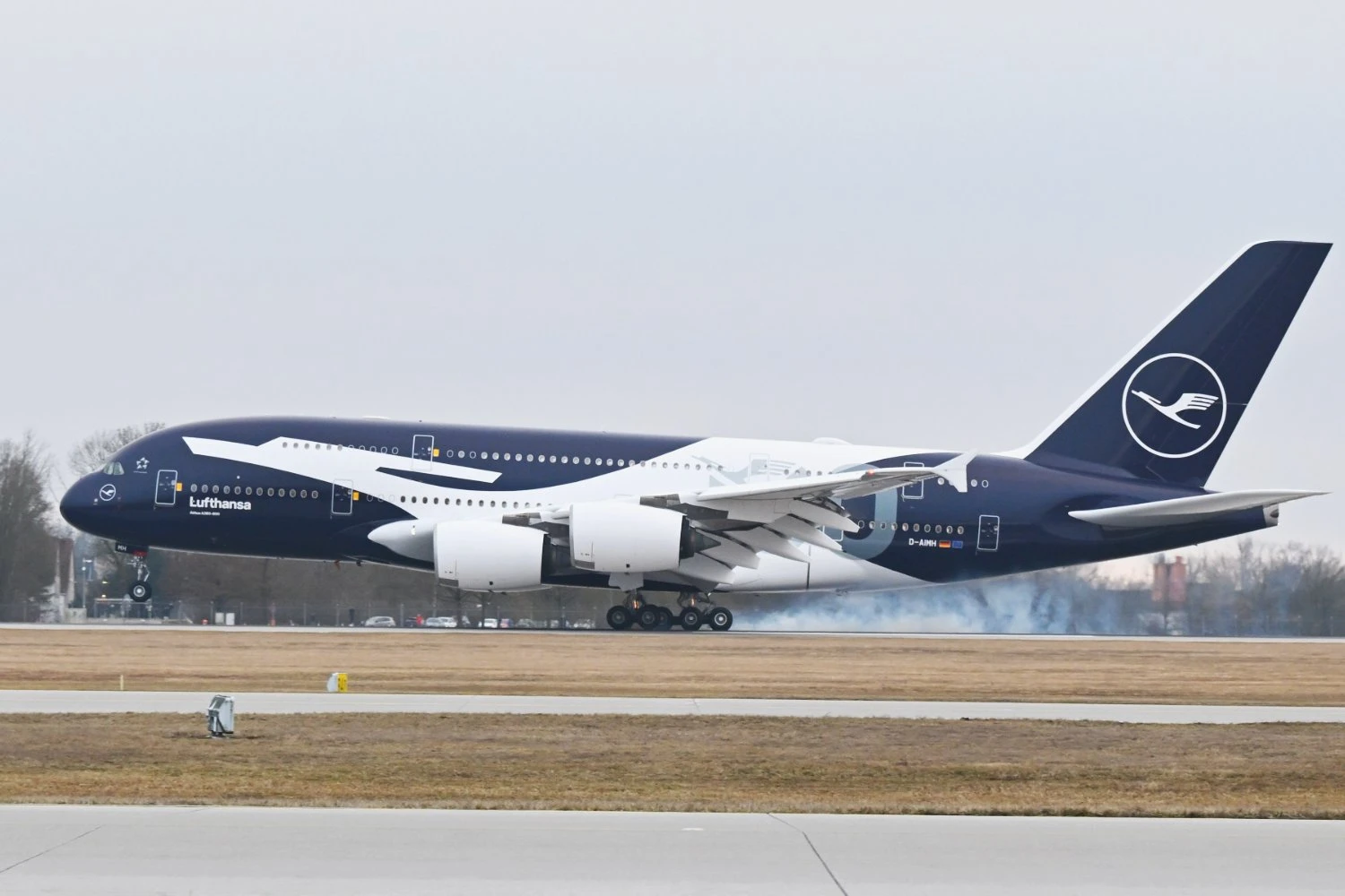 The aircraft, registered D-AIMH, arrived at Munich Airport on flight LH9901 after repainting work in Shannon, Ireland. The jet now features an oversized stylized crane along the fuselage, alongside the markings “1926 | 2026” and “100,” referencing the founding of the original Deutsche Luft Hansa in 1926.