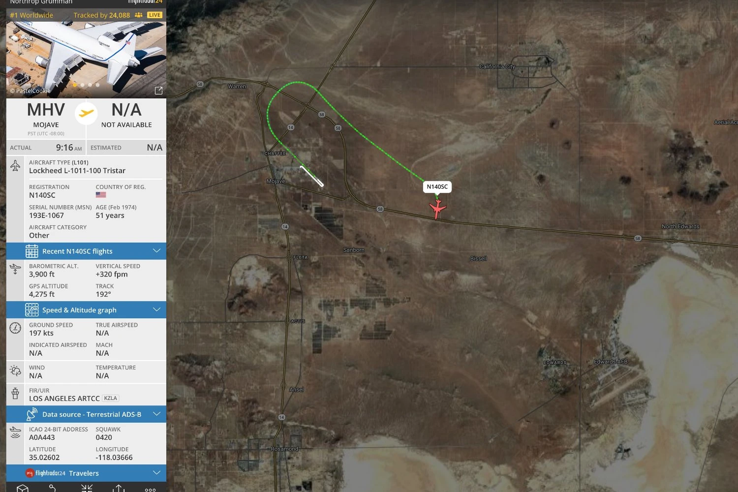 The L-1011, registered N140SC and operated by Northrop Grumman, carried out a short sortie in the Mojave area, marking one of its periodic flights in recent years. Although the aircraft has not supported an orbital launch mission since 2021, it continues to fly on test and research-related operations for undisclosed customers.